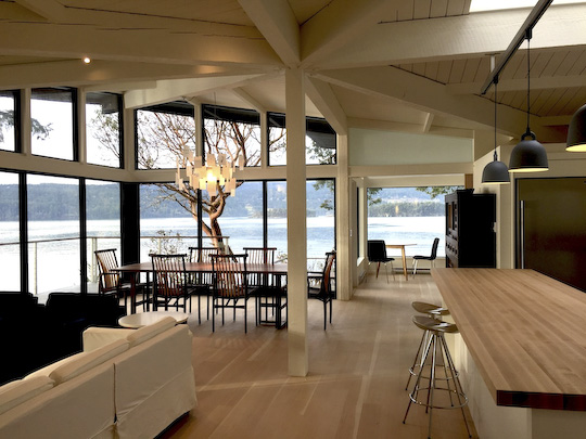 Sited on a high bank and built in the 1960's, the original design for this southwest facing single family dwelling incorporated an open plan main space with a folded plate roof supported by a centrally located post being then followed up with an addition in the 1970’s. The living room fireplace, kitchen and primary circulation spine were repositioned resulting in improved spatial function and offering dramatic site lines in a simple crossing plan.